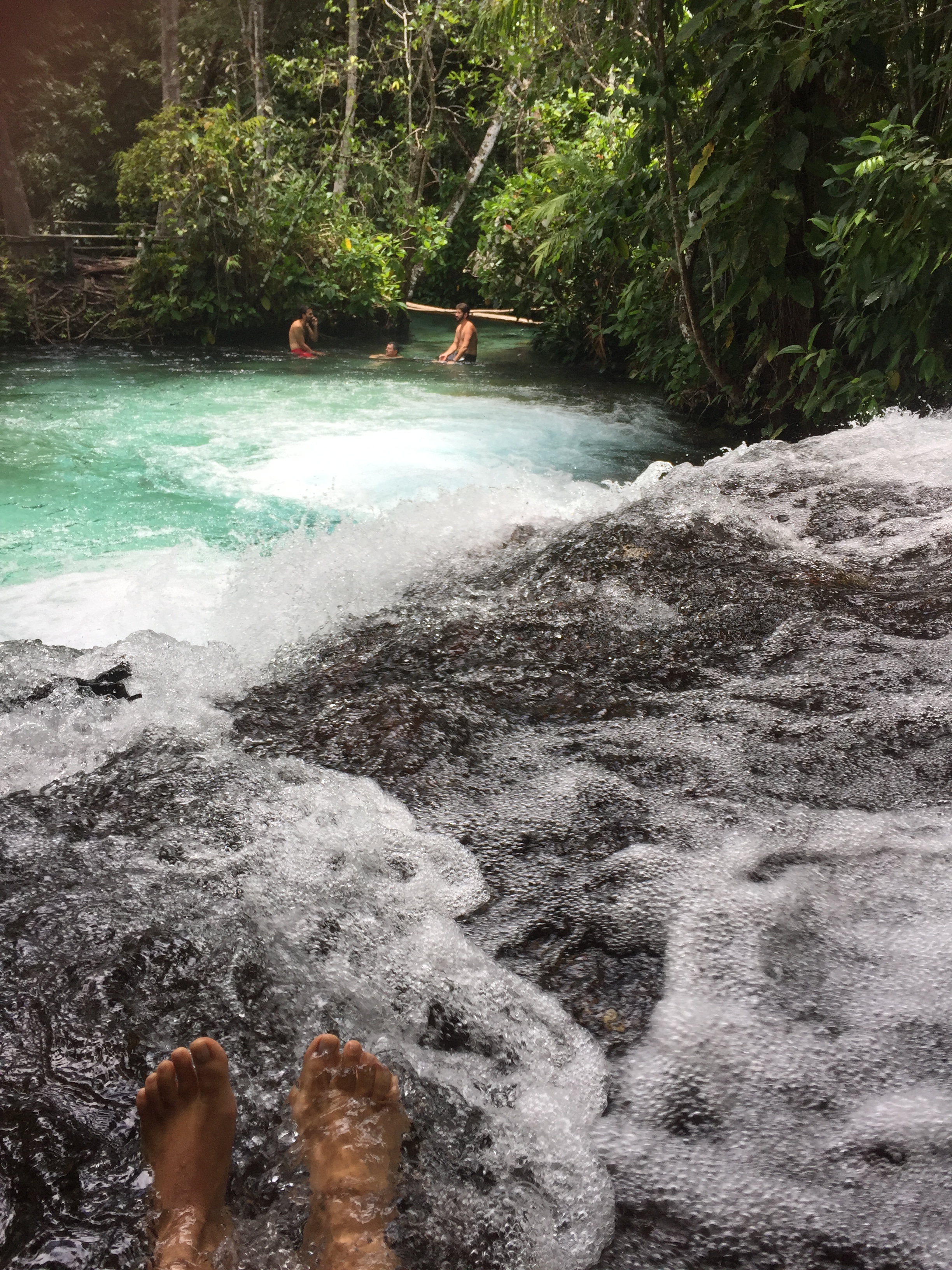 Depois, começa a exploração. A água é morna, os mergulhos mostram a vida dos peixes e a areia fina e branca do fundo, a aproximação com a cachoeira te faz sentir a força e pressão da água mas mergulhando e nadando com vontade chegamos às pedras onde esta a queda da cachoeira e ali podemos subir. Em cima, a vista se mostra diferente e inúmeros minutos se passam nesta contemplação onde a corrente das águas ao mesmo tempo que massageiam as costas forçam seu corpo para a queda, mas as pedras rústicas em formatos perfeitos para sentar te protegem e garantem o conforto na posição.