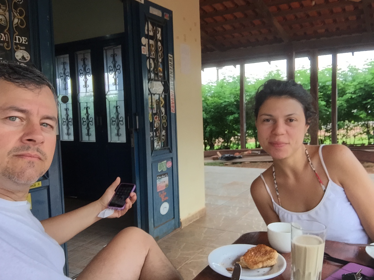 No agradável café da dona Jô (pousada Panela de Ferro) conhecemos novos amigos ciclistas. O Leo, professor de matemática carioca, contou algumas histórias muito boas. Uma delas foi que em uma aula no interior de Rondonia, a céu aberto, em condições precárias, ele estava tentando atrair a atenção dos alunos quando passou uma anta e ele exige atencao dos alunos. Só depois ele percebeu que era o almoco passando!