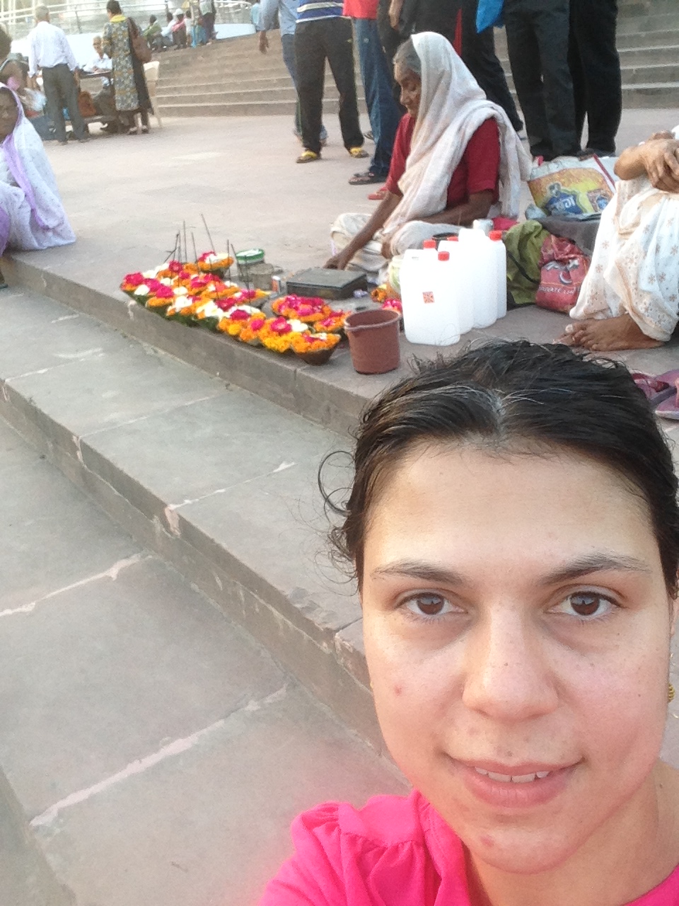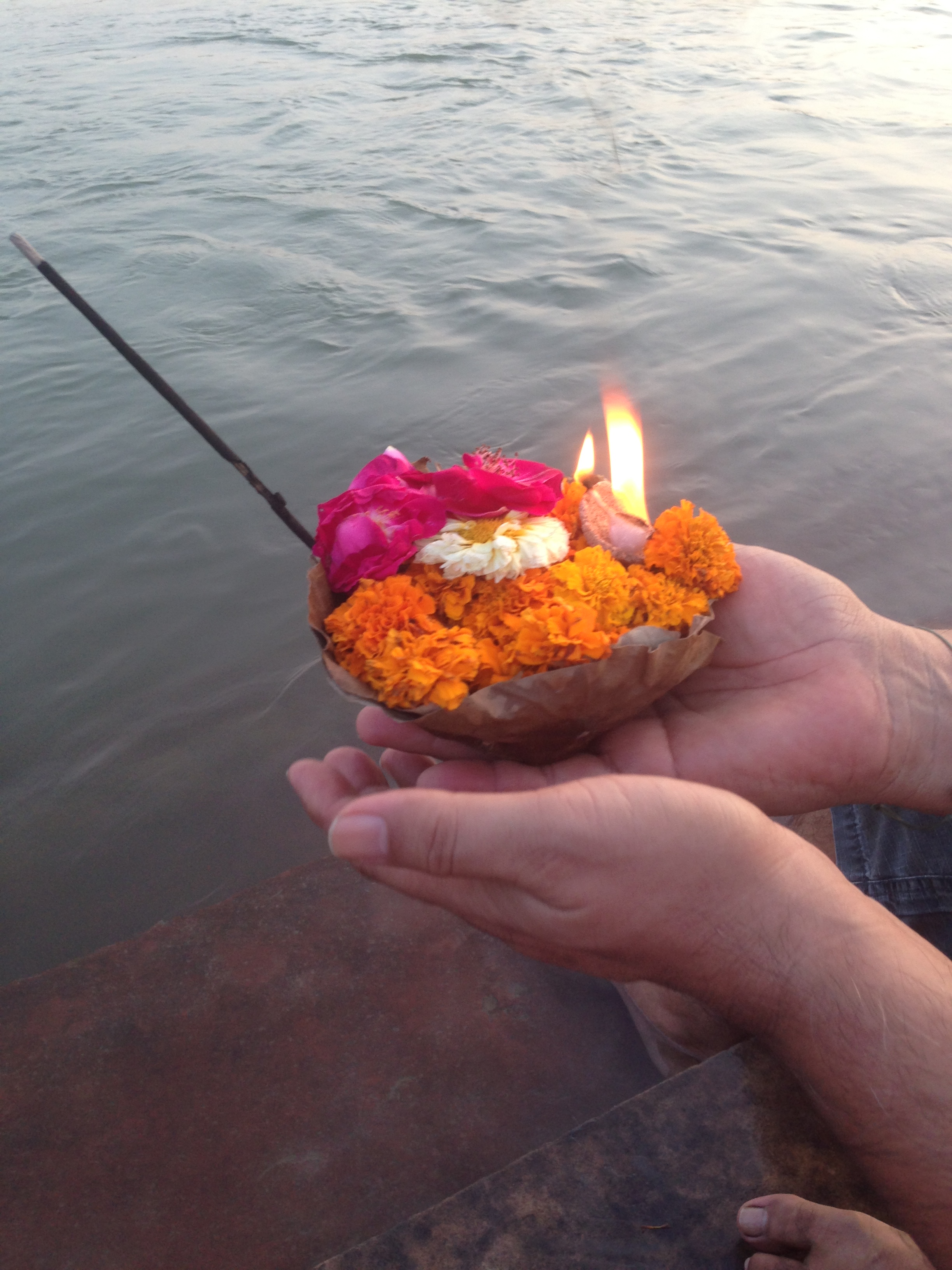 Depois entregam uma oferenda ao rio, normalmente preparadas e vendidas por 10 rupias pelas mulheres ou crianças aparentemente “de rua” ou muito pobres. A oferenda é preparada com flor de lotus sobre folhas e vem com uma pequena vela e um incenso e após acender, é só lançar ao rio.