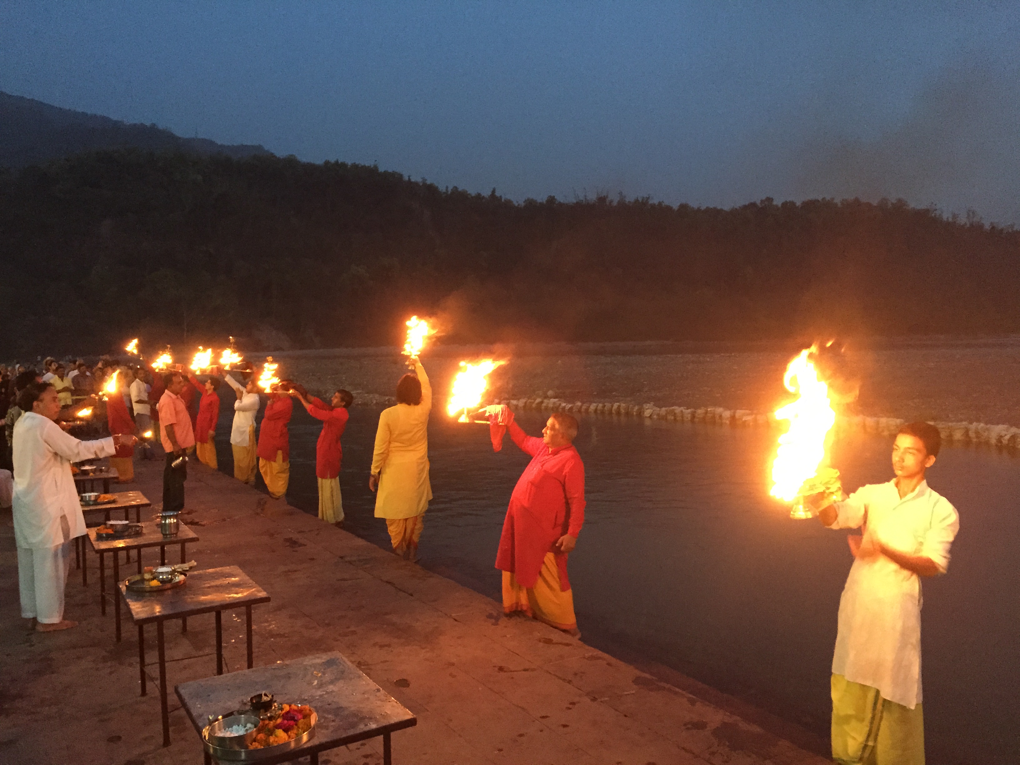 Diariamente a céu aberto, às margens do Ganga, acontecem os rituais Hindu, sempre ao por do sol, com início às 18:30 nesta época do ano. Tais rituais são os chamados de Ganga Aarti. Tive chance de acompanhar este ritual vários dias enquanto estive na India tanto em Rishikesh quanto em Haridwar, este último um dos três maiores da India – os outros dois são Varanasi e Allahabad, sendo Haridwar o maior e mais sagrado do estado de Uttarakhand.