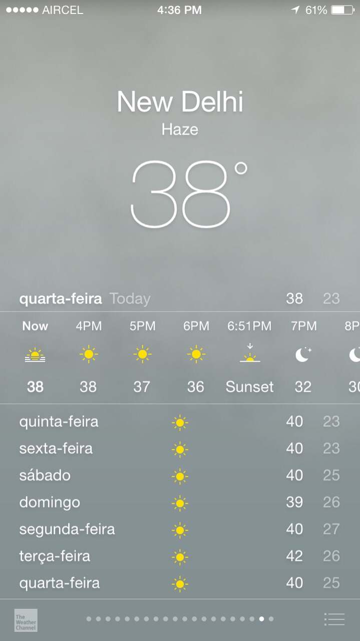 A partir do dia 22 de abril a situação ficou difícil, mesmo pra nós brasileiros, com temperaturas próximas a 40 graus.Imagina 20 dias de sol e calor, é tudo que queremos, certo? Sim, mas para férias pois a qualidade de vida pra quem vive sob tal clima não deve ser nada fácil. Aqui no norte da India esse clima dura 3 meses, de abril a junho, com pouca umidade e sol escaldante. No meu caso, tive 1 dias de constante tontura e mal estar generalizado assim que a temperatura subiu muito e depois já melhorei.