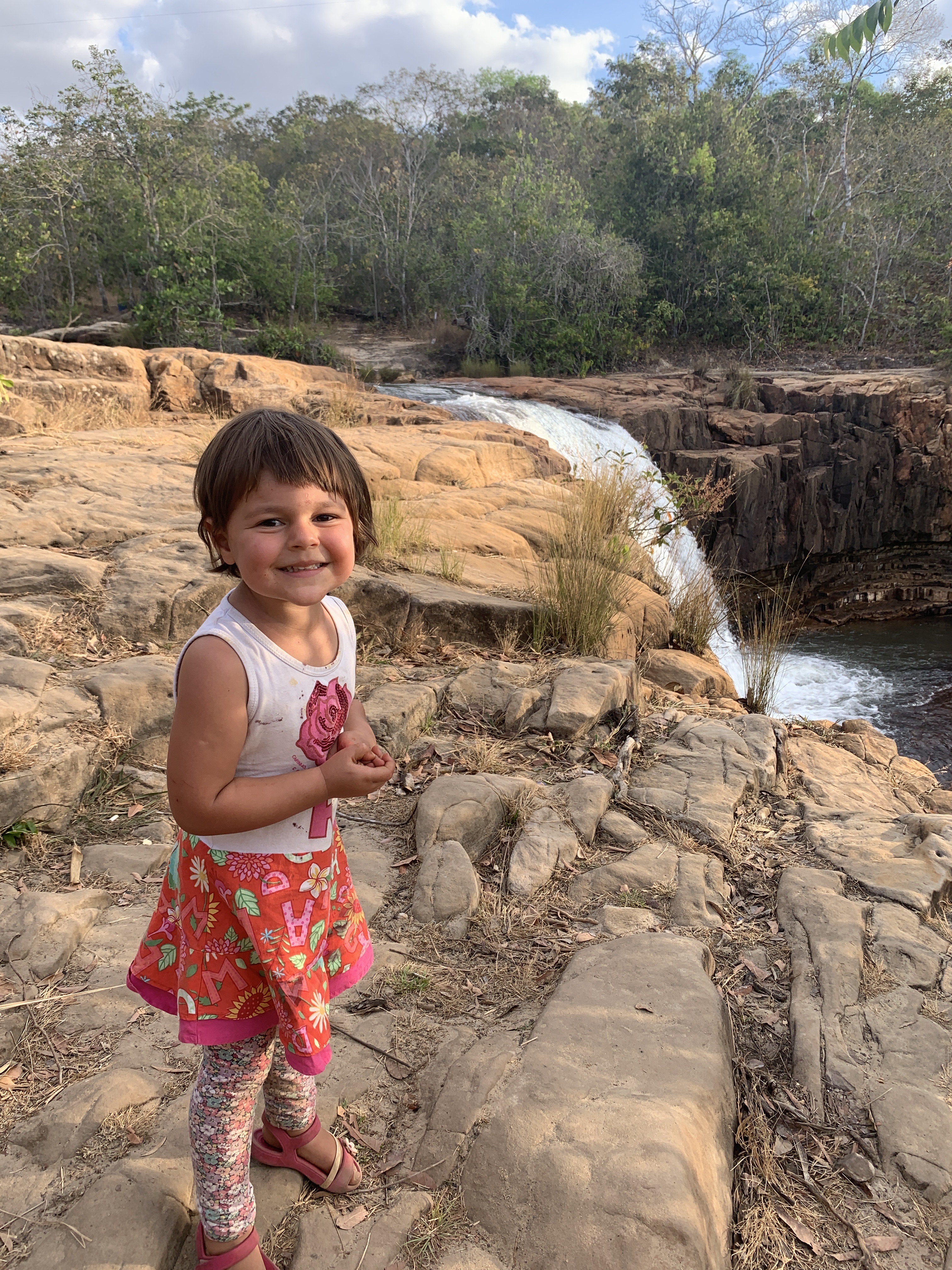 Em resumo a trilha inclui duas cavernas, uma cascata que não pudemos nadar porque não daria tempo (e depois teríamos que repor o repelente já que o local é impossível de tantos mosquitos), duas pontes que balançam sucesso pra crianças e finalmente a lagoa azul. Quando chegamos perto das 15 tinham várias pessoas ali esperando bater o sol que deixa a água ainda mais azul, o que não aconteceu nesse dia. Foi decepcionante pros adultos a falta do sol e pras crianças o fato de não poder nadar, mas valeu porque a lagoa era linda mesmo e claro, fotografar é preciso…dessa vez ao invés de xissss , o sorriso é de pequiiii, em homenagem ao cerrado.