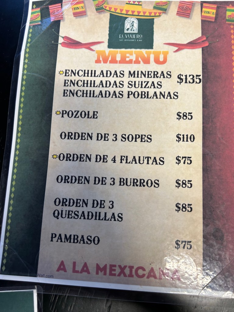 No caminho a pé primeiro paramos desesperadamente num restaurante para o Dimitri poder ir ao banheiro. Ali pedimos uma Pozole e para manter a tradição do Mauricio, quesadillas. Pozole é uma sopa maravilhosa, com frango e salsa bem sabor local, difícil de traduzir pra nossa realidade no Brasil.