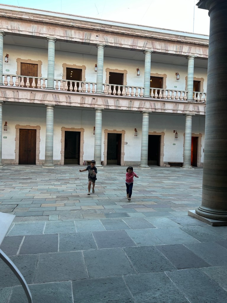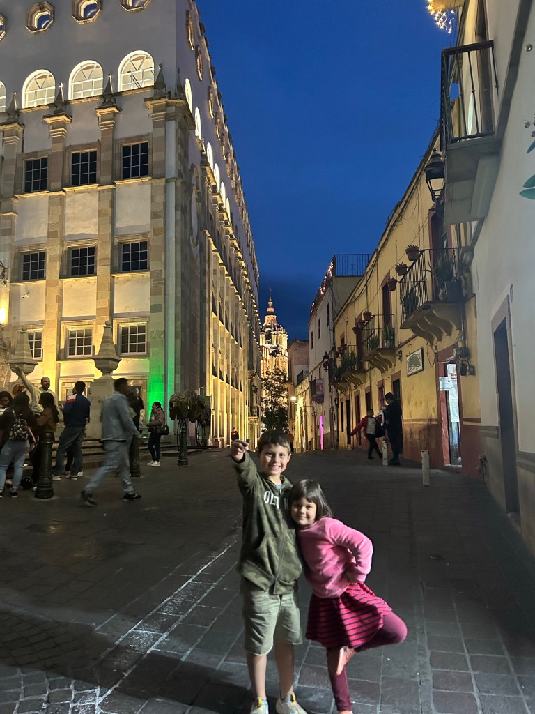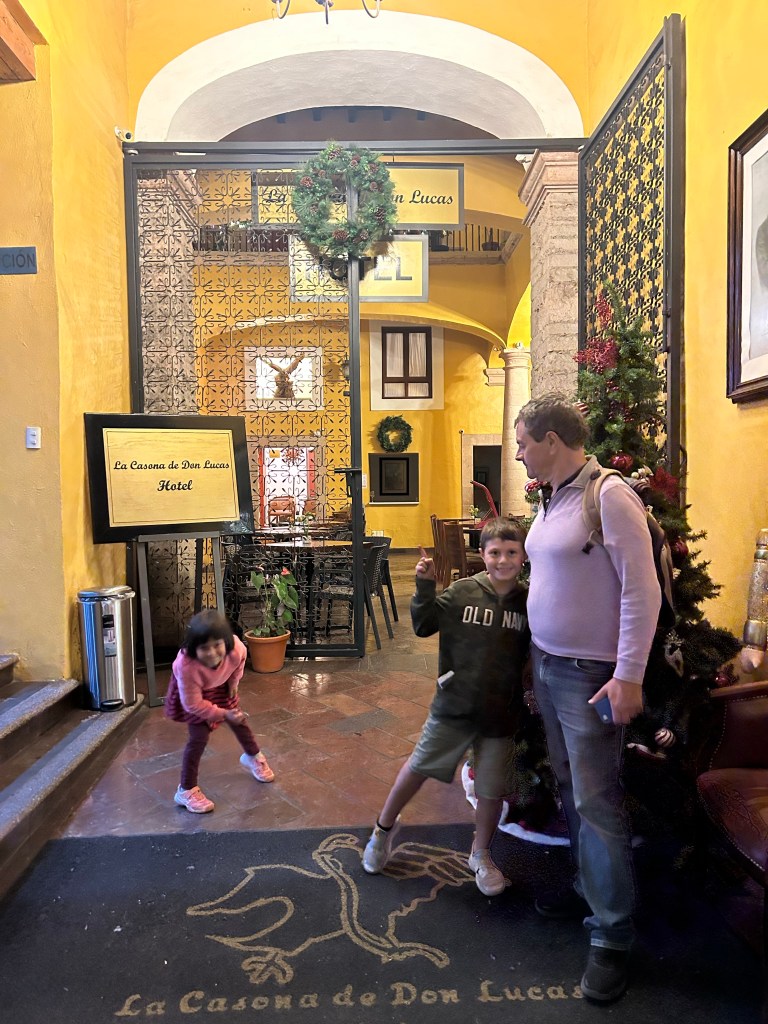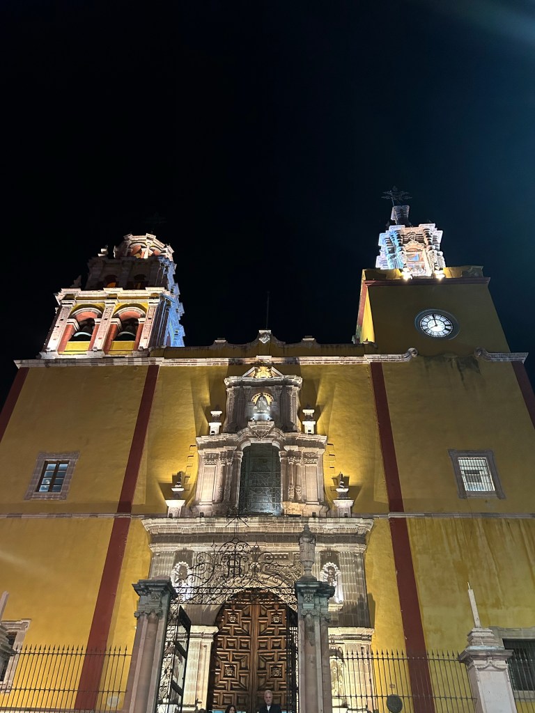 Fomos subindo a cidade sentido à Basílica de Guanajuato. O dia estava terminando mas não fazia tanto frio e o céu foi passando de azul claro para escuro até anoitecer. Vimos as luzes da cidade sendo acendidas, percorremos pequenas ruas, subimos ladeiras e após algumas visitas a hotéis, optamos por ficar no “La Casona de Don Lucas” que fica na Praza de la Paz.