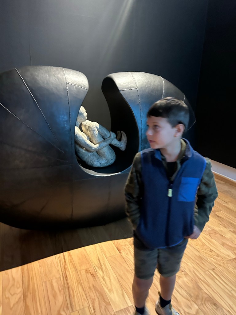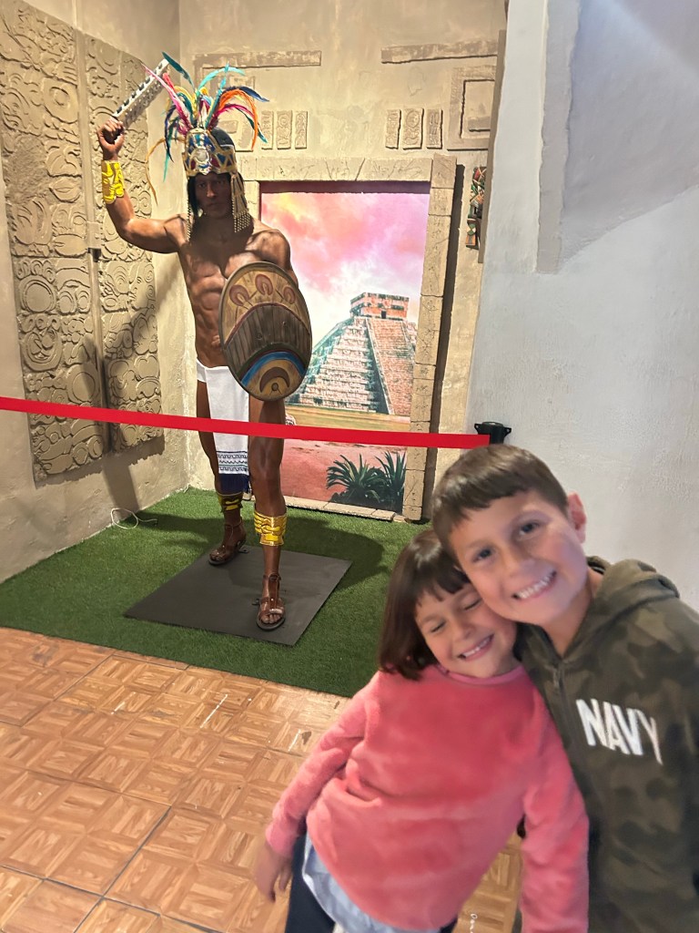 Museu de pedras com vidros, a gente viu uma caveira. Tentamos assustar o Dimitri com uma espinha que fazia barulho qunando a pessoa estava indo ver o peixe. Dimitri não quis ir mas o papai foi e fez o barulho, e eu e o Dimitri ficamos brincando de fazer o barulho.