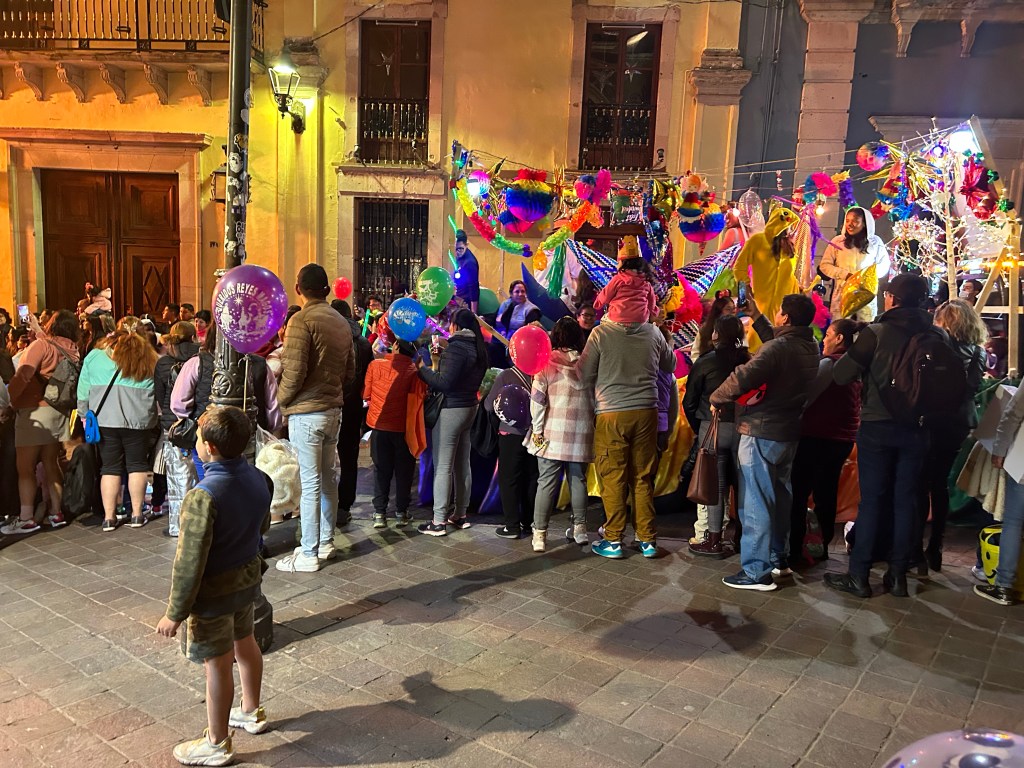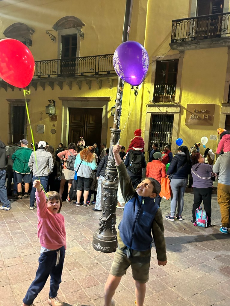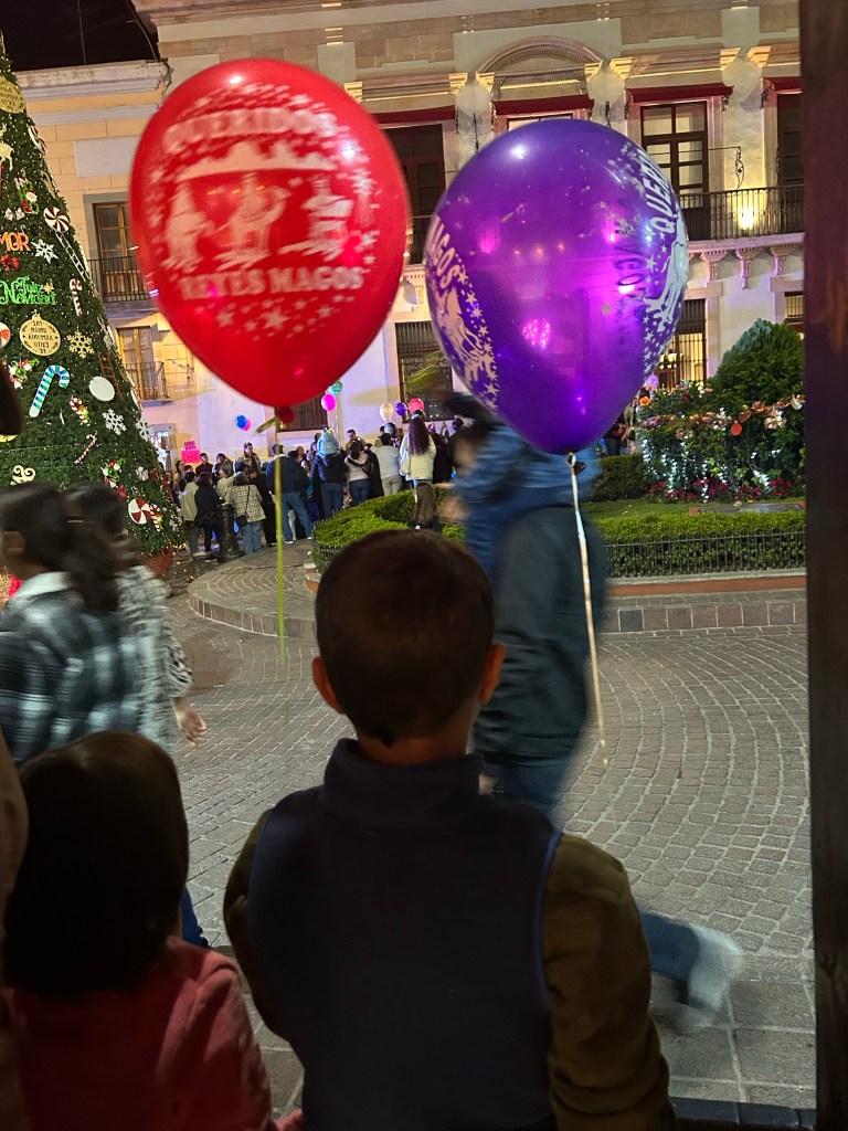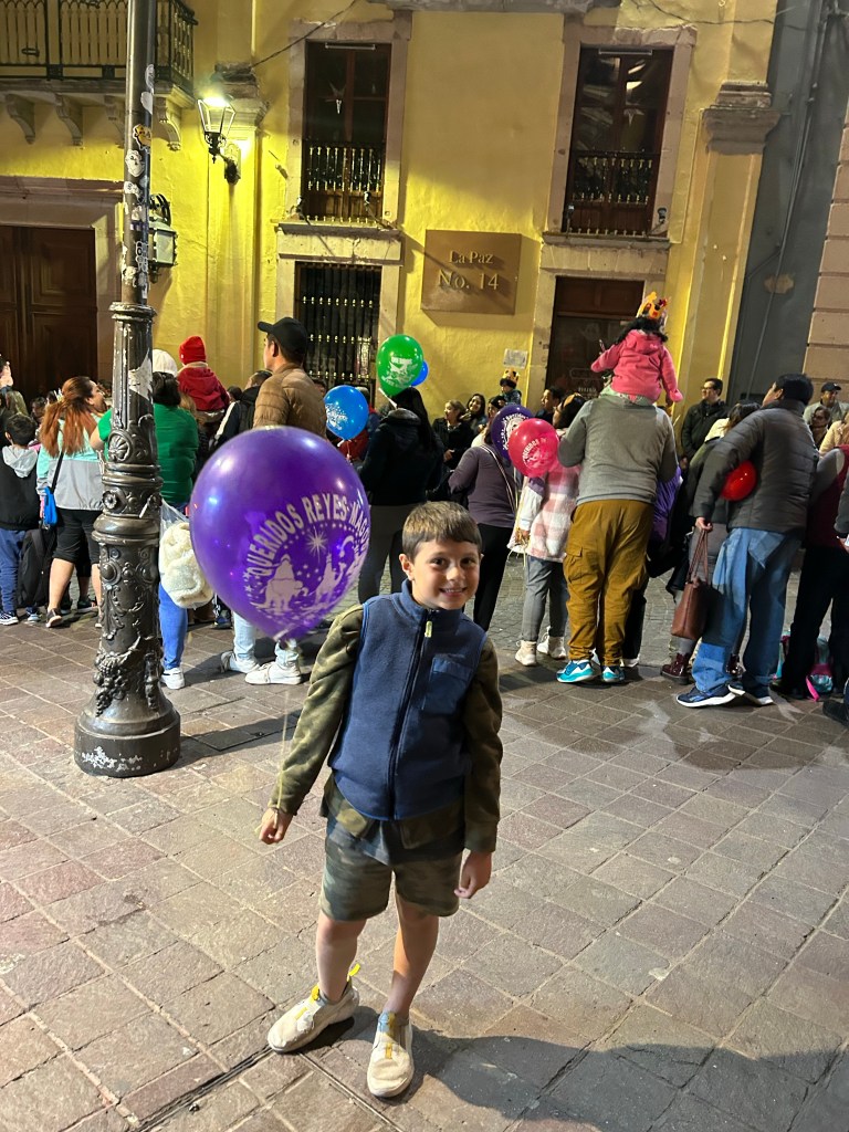 Dia de reis no Mexico tem a tradição de cada criança ter uma balão de gas hélio e soltar ao final de um desfile. Antes de termos o nosso ficamos observando as crianças q deixavam o balão voar sem querer. Daí eu e a mamãe fomos procurar pra comprar e andamos muito até achar uma mulher com o gas enchendo os balões, corremos pra reencontrar o papai e Dimitri. No desfile a gente viu os carros passando com as pessoas em cima, os bichos em cima, pessoas q a gente nunca viu, tipo Olaf, Ana, Elza. Teve um fogo tão alto que ate machucava meu olho. Teve a mulher maravilha, foi uma grande festa. Tomamos sorvete depois, o melhor foi o meu, de morango.